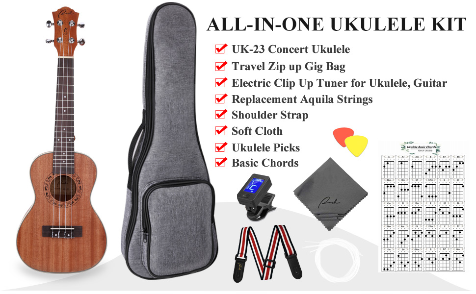 The Ranch Pro Ukulele Kit includes everything you need: one Ranch ukulele with Aquila strings installed, a well-padded 10mm gig bag, a digital tuner with battery, an extra set of 4 Aquila strings, a strap, a microfiber polishing cloth, and step-by-step 12 online lessons https://www.ranchguitar.com/ukulele-beginner-lessons/. We’ve prepared everything a beginner needs.