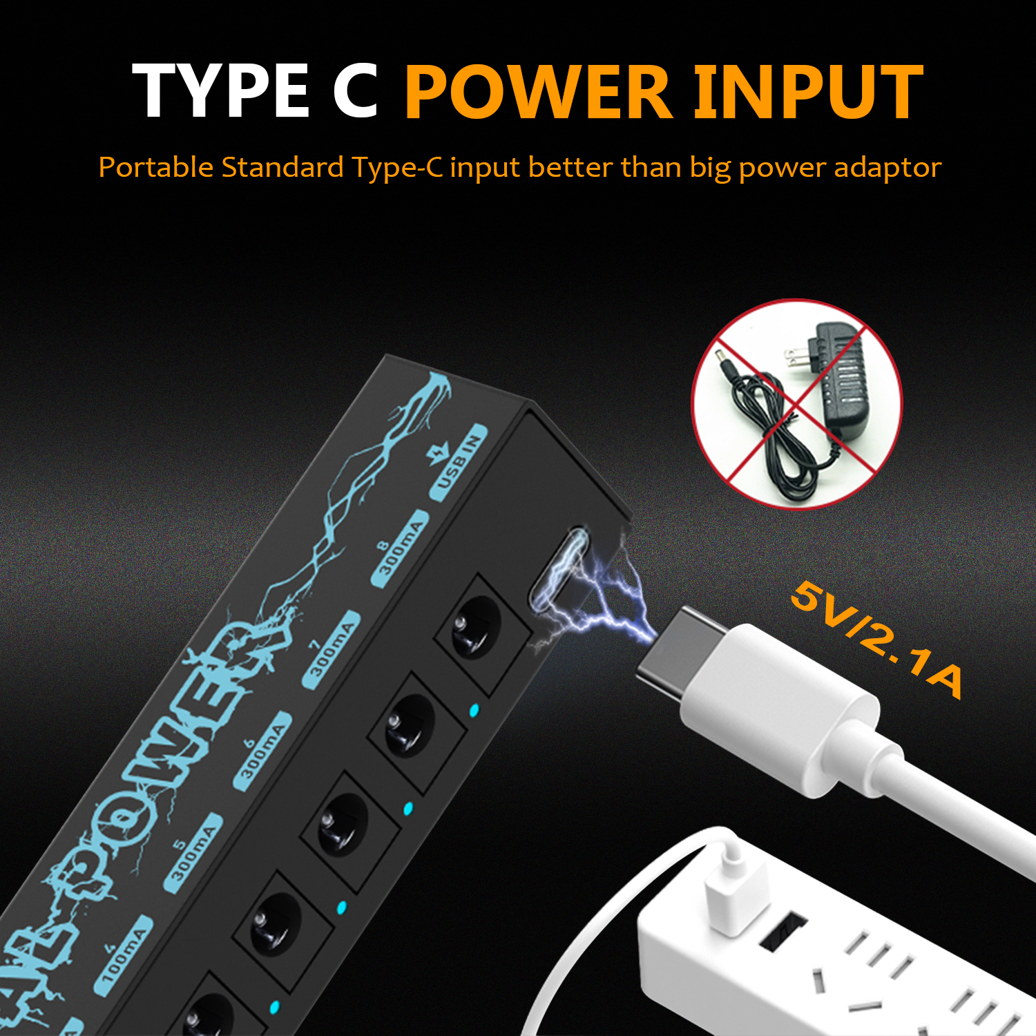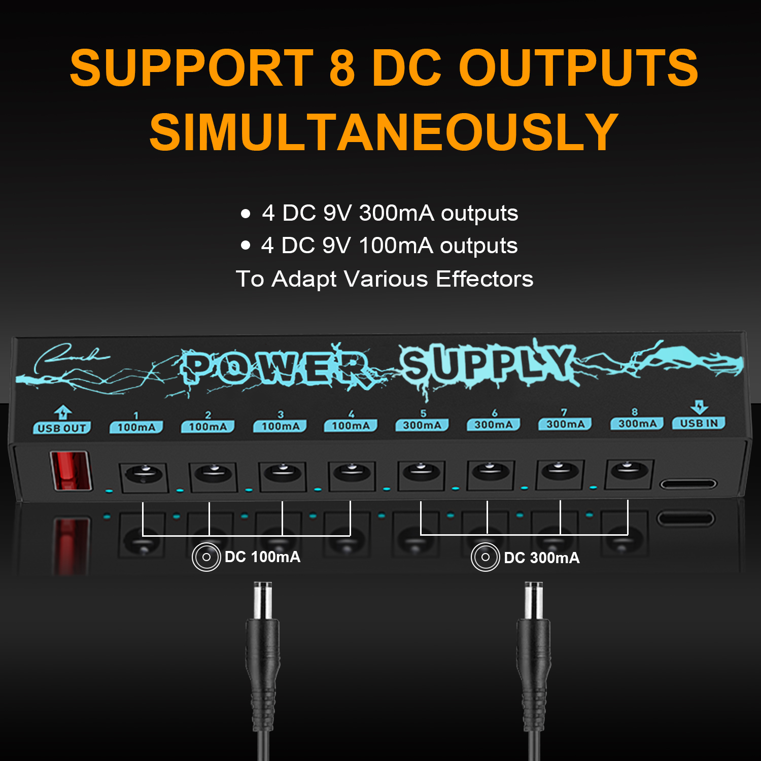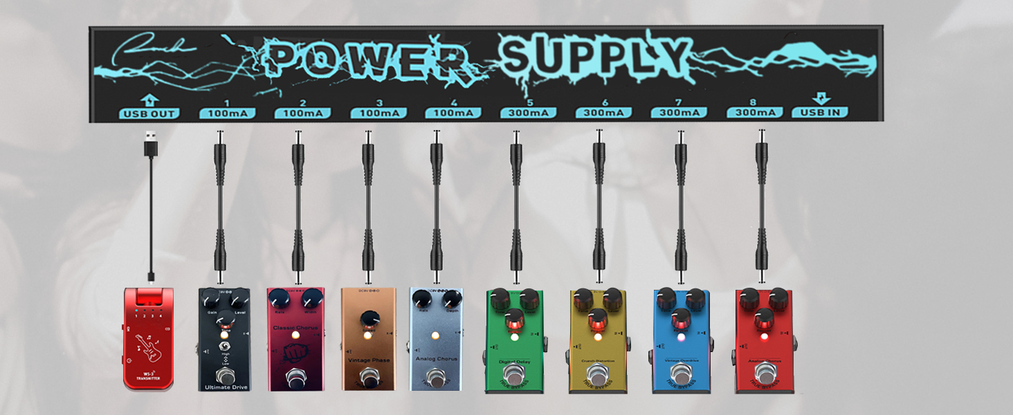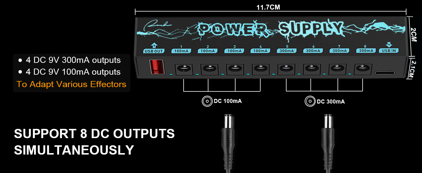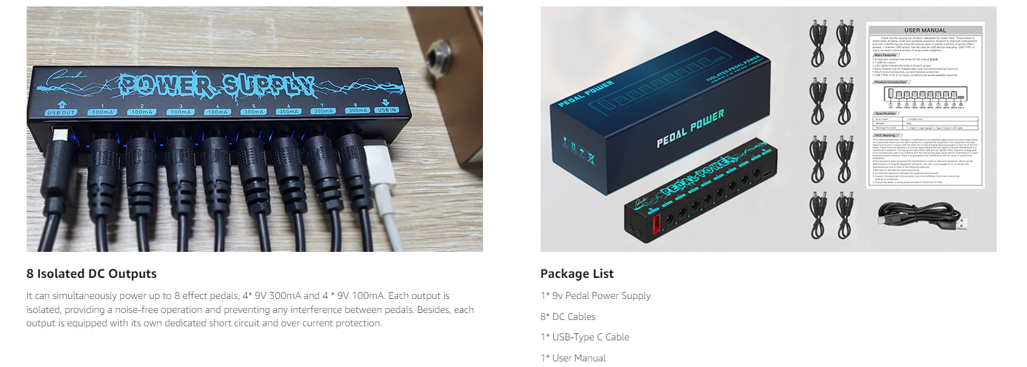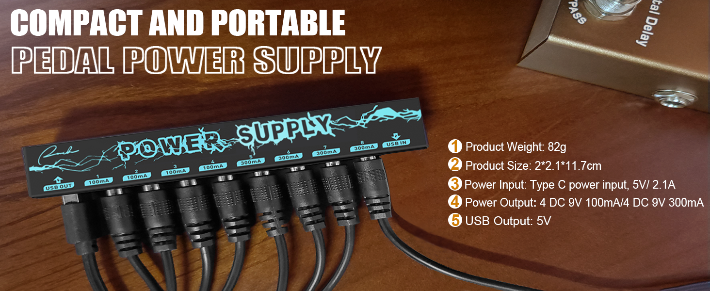 🎸 Enhanced Adaptability and Charging Option: The Ranch Pedal Power Supply offers enhanced adaptability with its multiple connectivity options. Featuring a Type C power input and a 5V USB output, you can power your effect pedals while conveniently charging your compatible devices, such as smartphones or tablets. The Type C power input ensures fast and efficient charging for a versatile and reliable power solution for both your musical and personal needs. 🎸 Multiple Power Outputs for Simultaneous Use: Equipped with 8 individual power outputs, including 4 * 9V 300mA and 4 * 9V 100mA, this pedal power supply can power up to 8 effect pedals simultaneously. Each output is isolated, providing noise-free operation and preventing interference between pedals. The regulated DC power output ensures stable and clean power supply to your effectors, eliminating unwanted hum or low-quality sound caused by inconsistent power sources. 🎸 Individual Short Circuit and Over Current Protection: Each output of the Ranch Pedal Power Supply is equipped with dedicated short circuit and over current protection. In the event of a short circuit or excessive current draw on one output, only that specific output is affected, while the rest continue to function normally. This feature ensures the safety of your pedals and prevents any potential damage. 🎸 Compact and Portable Design: With a focus on portability without compromising performance, the Ranch Pedal Power Supply is designed to be compact and lightweight, weighing only 82g. Its streamlined design seamlessly integrates into your pedal board setup, allowing you to take your music anywhere with ease. Whether you’re gigging, recording, or practicing, this power supply’s portable nature ensures convenience without sacrificing power. 🎸 Easy-to-Use and Monitor: The Ranch Pedal Power Supply is designed for ease of use and monitoring. The LED indicators for each output allow you to monitor the power status of your effectors at a glance, minimizing guesswork and providing a hassle-free experience.
