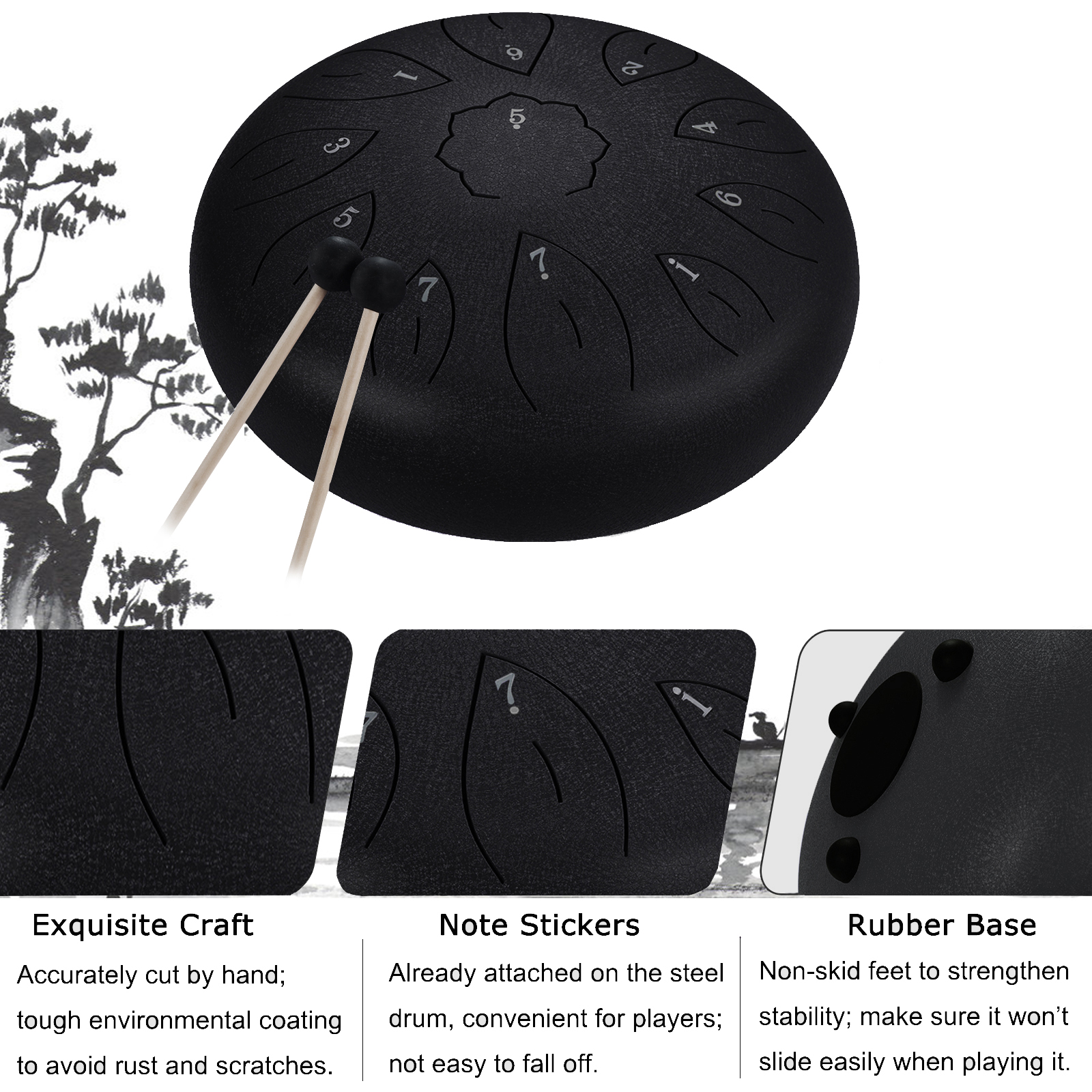 ♬【Easy for Beginners】This steel tongue drum comes with a sample music book that easy to read and follow, and a well padded bag for easy carrying. One set of note stickers was already attached on the Handpan drum, enable beginners to learn and play it more easily. Dispense with a complex music theory system or a very high music basis, it is really not a difficult thing to get started on this new music instrument.