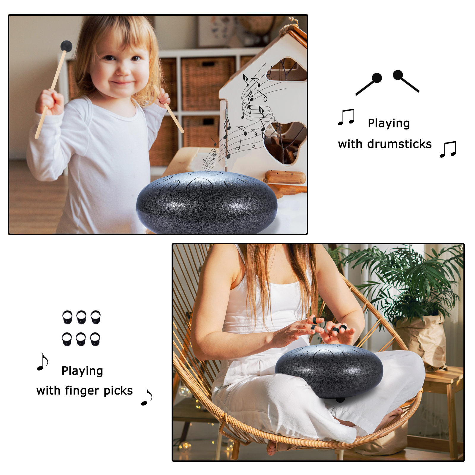 ♬【A Complete Steel Tongue Drum Kit】It comes with a 12 inches alloy steel tongue drum, a carry bag, 2 pairs of drum mallets, a mallet bracket, 6 finger picks, a music book and an extra set of note stickers. We’ve prepared everything needed for you to start learning the steel tongue drum here. There are 2 ways to play, you may play it easily with the drum mallets or with your hands with finger picks put on.