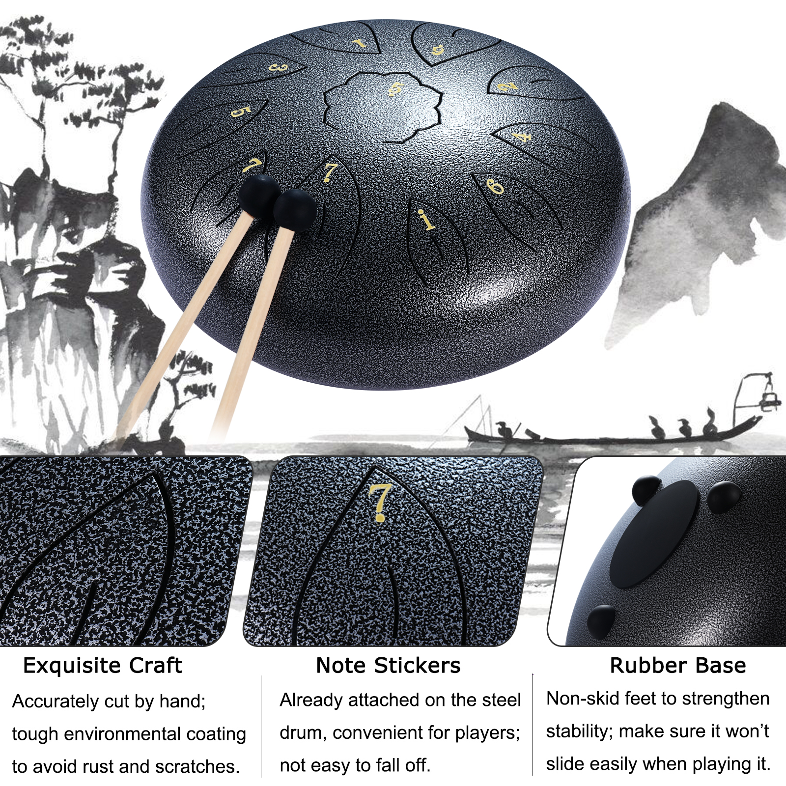 ♬【Easy for Beginners】This steel tongue drum comes with a sample music book that easy to read and follow, and a well padded bag for easy carrying. One set of note stickers was already attached on the Handpan drum, enable beginners to learn and play it more easily. Dispense with a complex music theory system or a very high music basis, it is really not a difficult thing to get started on this new music instrument.