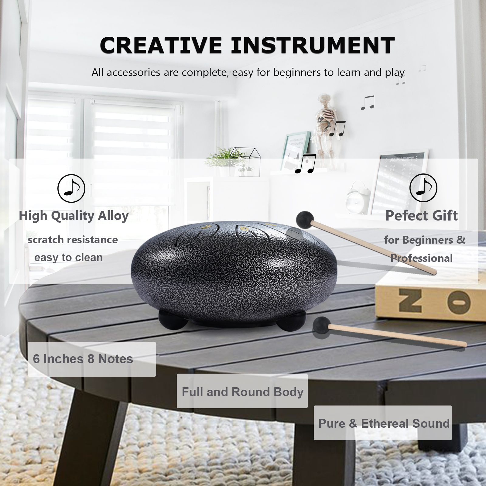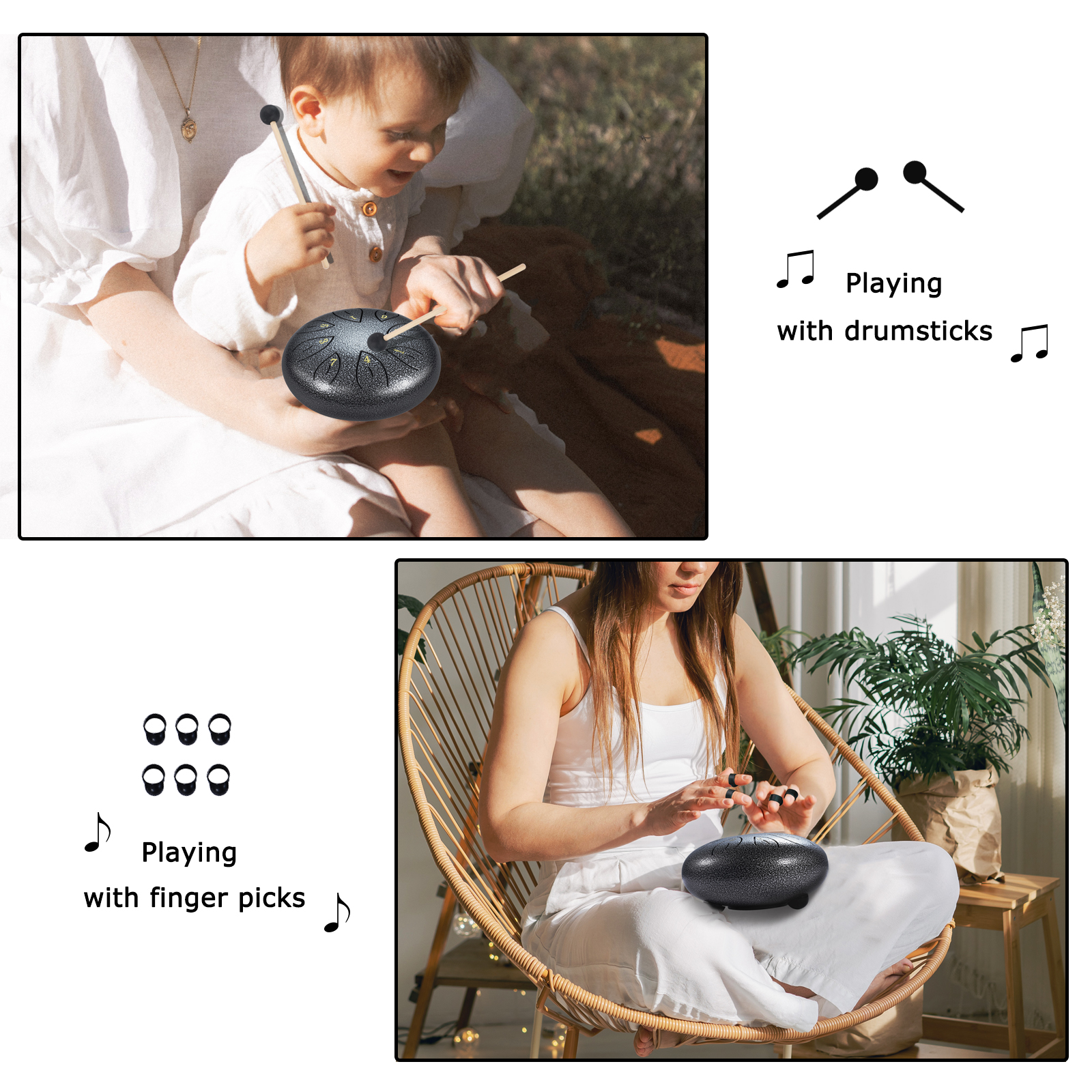 ♬【A Complete Steel Tongue Drum Kit】It comes with a 6 inches alloy steel tongue drum, a carry bag, a pair of drum mallets, a mallet bracket, 6 finger picks, a music book and an extra set of note stickers. We’ve prepared everything needed for you to start learning the steel tongue drum here. There are 2 ways to play, you may play it easily with the drum mallets or with your hands with finger picks put on.