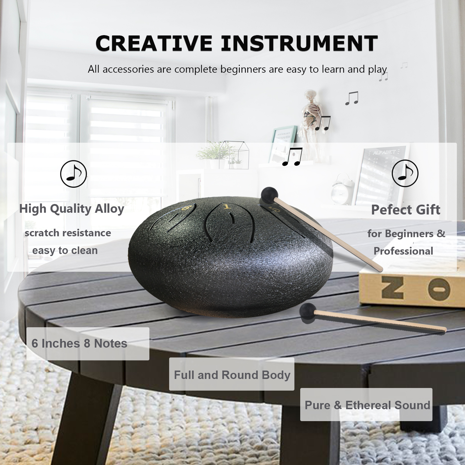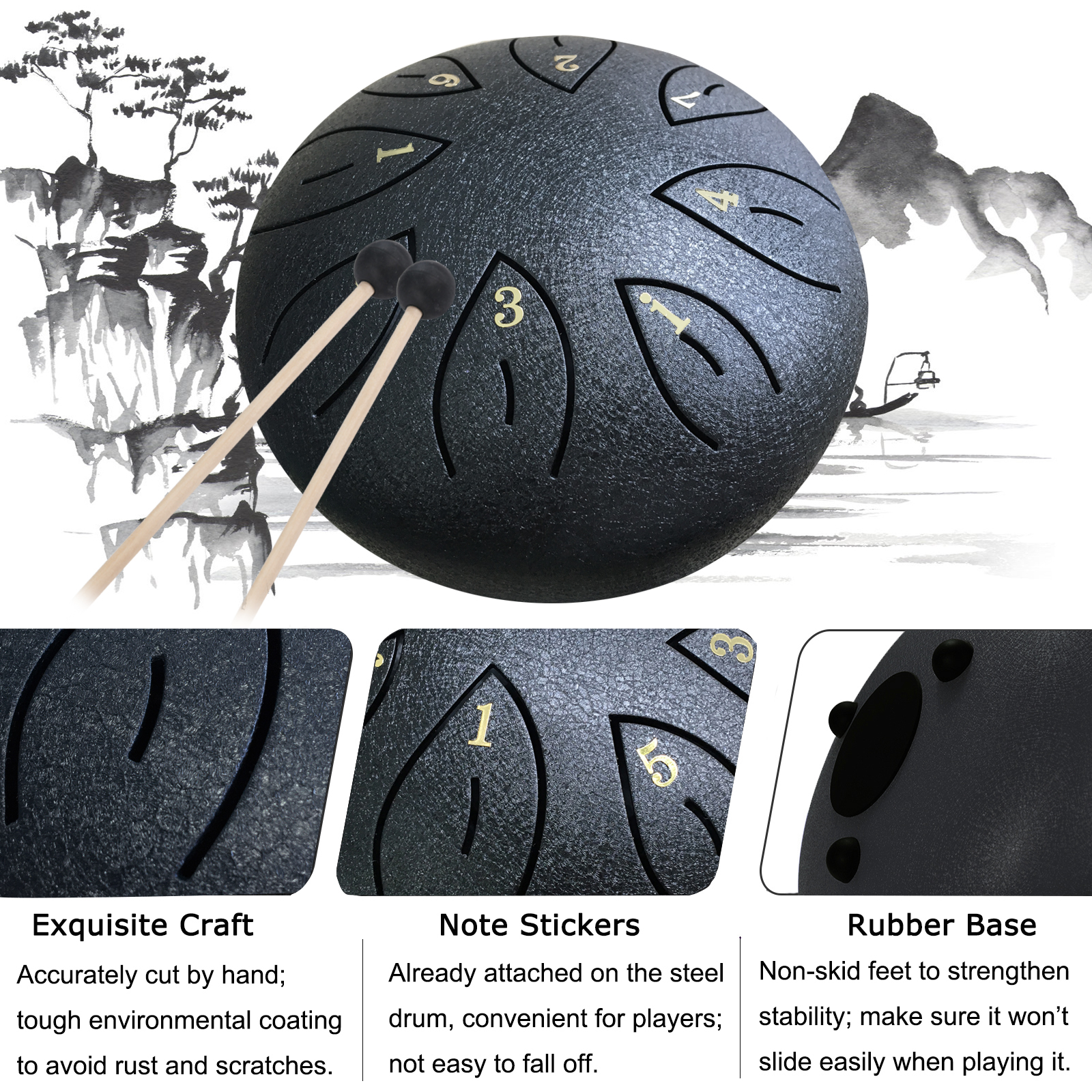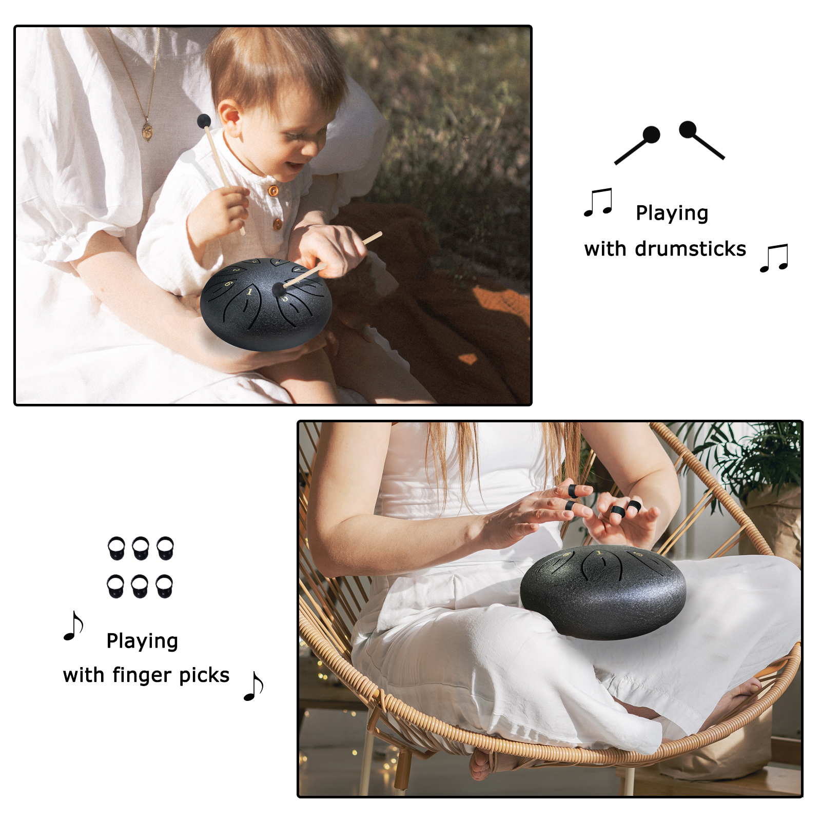 ♬【A Complete Steel Tongue Drum Kit】It comes with a 6 inches alloy steel tongue drum, a carry bag, a pair of drum mallets, a mallet bracket, 6 finger picks, a music book and an extra set of note stickers. We’ve prepared everything needed for you to start learning the steel tongue drum here. There are 2 ways to play, you may play it easily with the drum mallets or with your hands with finger picks put on.