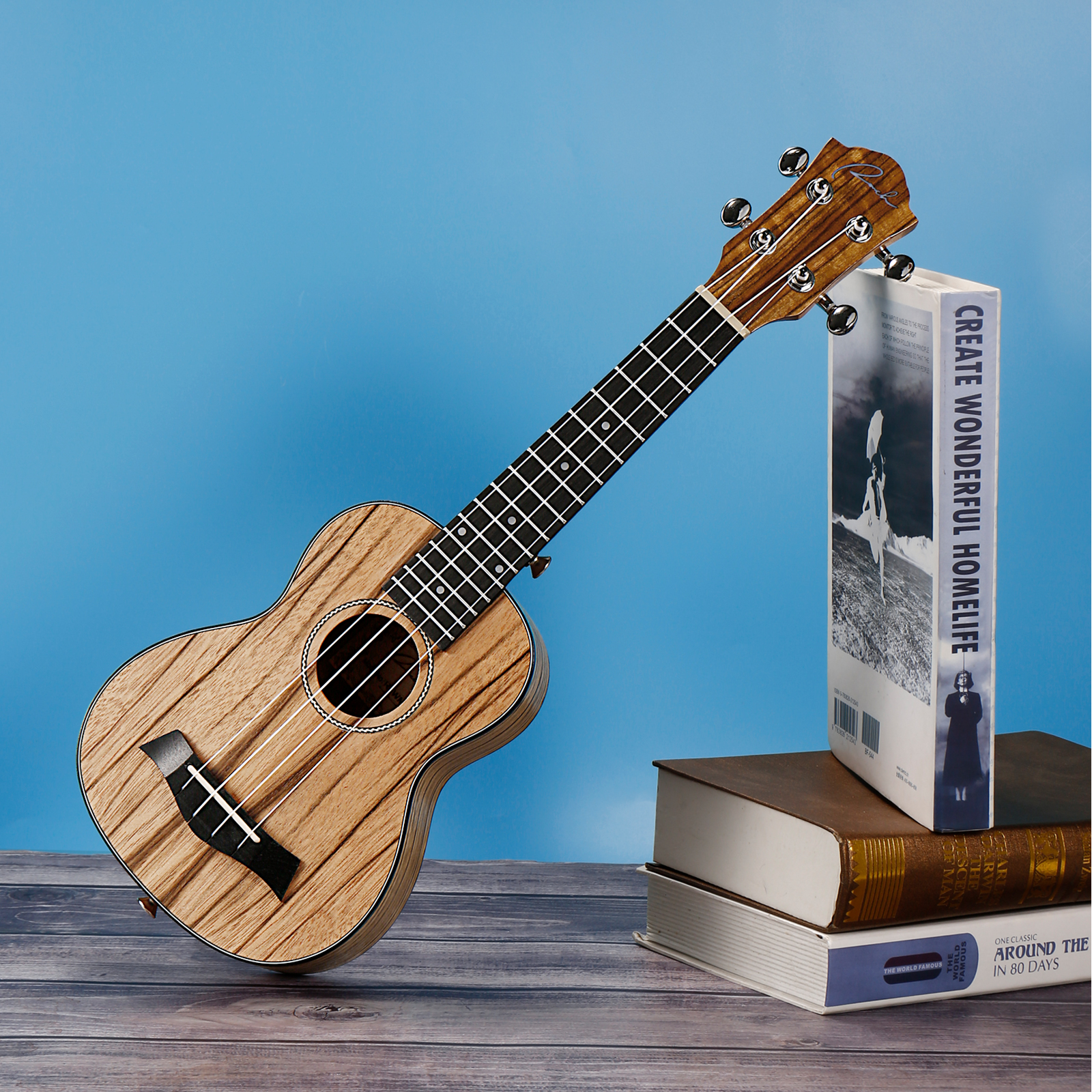 Traditional 21 inch Soprano ukulele Equipped with Aquila strings already and silver geared tuners, 15 silver nickel frets with fret position marks at 5th, 7th, 10th, 12th and 15th frets on top of fingerboard.